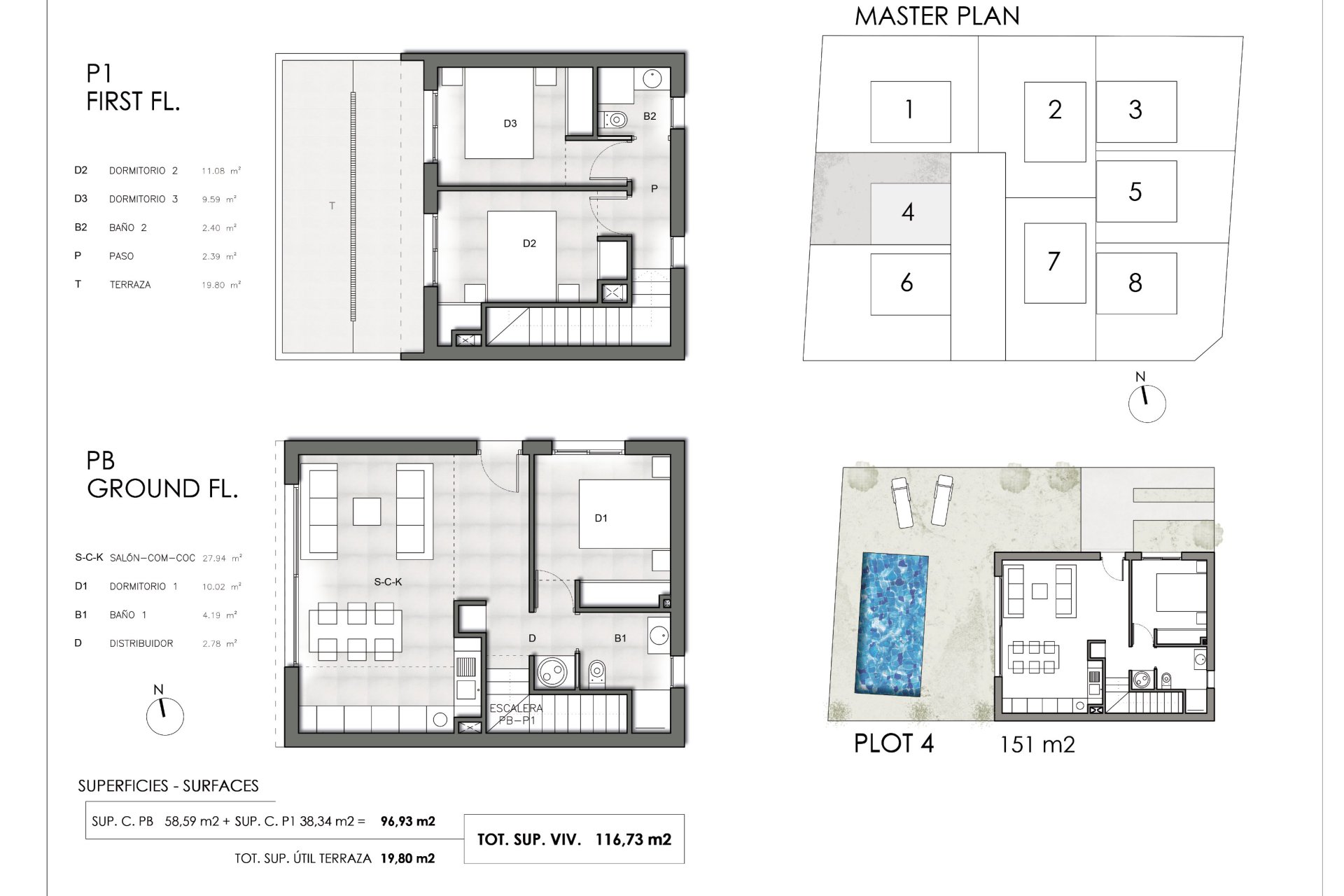 El interior de los adosados está diseñado para ofrecer el máximo confort. Cada vivienda dispone de 3 dormitorios y 2 baños, proporcionando un espacio amplio y funcional para toda la familia. Los suelos de cerámica aportan un toque moderno y son fáciles de mantener. Las persianas eléctricas y los electrodomésticos incluidos facilitan el día a día, mientras que los armarios empotrados ofrecen un almacenamiento eficiente. Además, la preinstalación de aire acondicionado asegura un ambiente agradable durante todo el año.