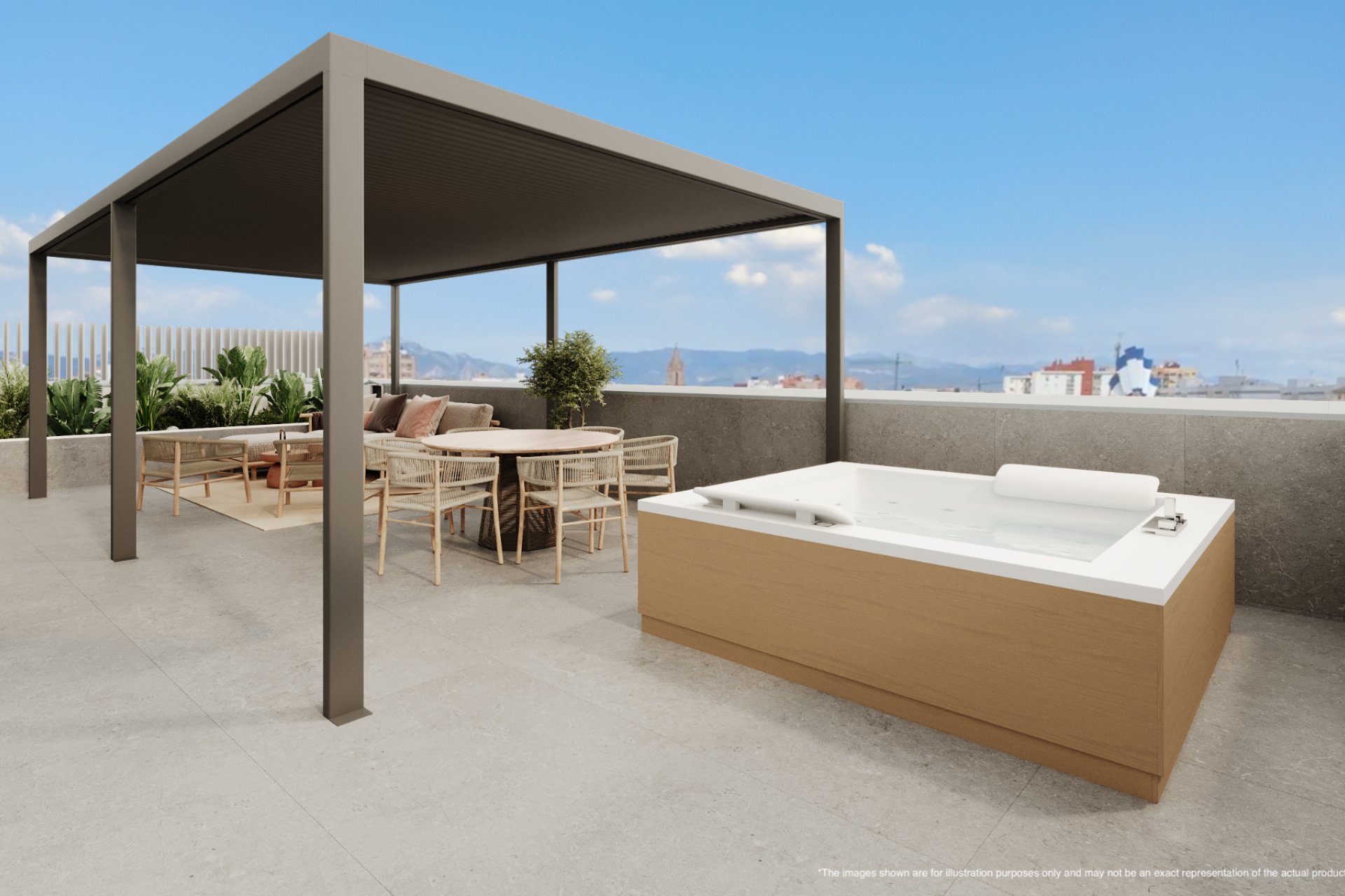 El sello distintivo de estas residencias es su amplia azotea privada, que refleja la planta de la casa inferior. No son simples balcones, sino salas de estar al aire libre totalmente equipadas: