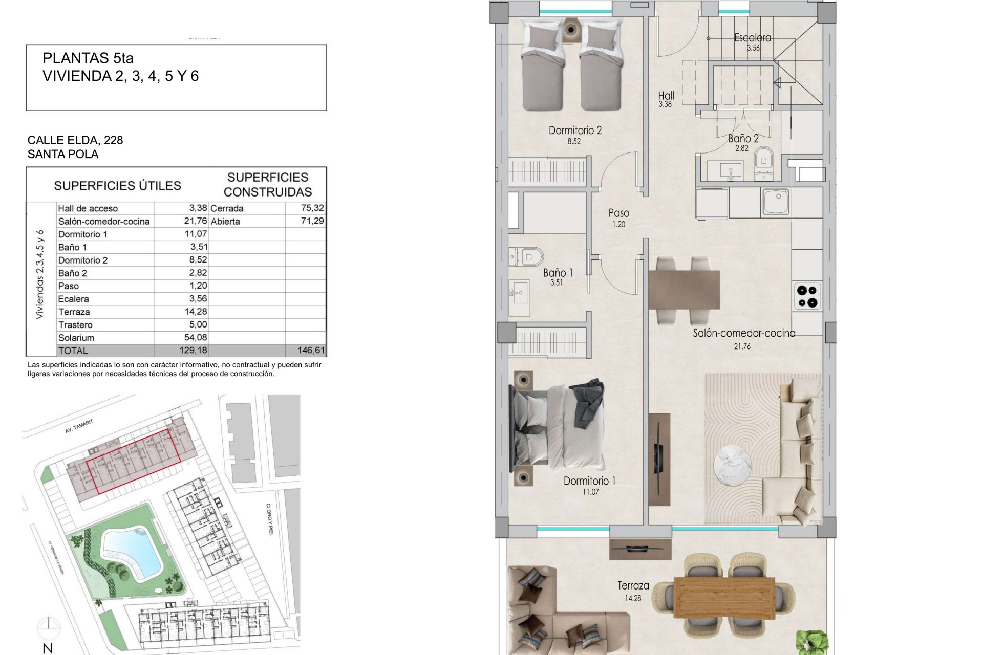 En el interior, las viviendas están diseñadas para ofrecer un espacio acogedor y funcional. Los apartamentos y áticos disponen de 2 o 3 dormitorios y 2 baños, adaptándose a diferentes necesidades familiares. La distribución incluye amplias terrazas, perfectas para disfrutar de las vistas y del clima templado de la región. Los acabados de calidad, como los suelos de cerámica y los armarios empotrados, aseguran un ambiente moderno y práctico, mientras que la posibilidad de contar con un solárium en algunas tipologías añade un valor adicional a la experiencia de vivir aquí.
