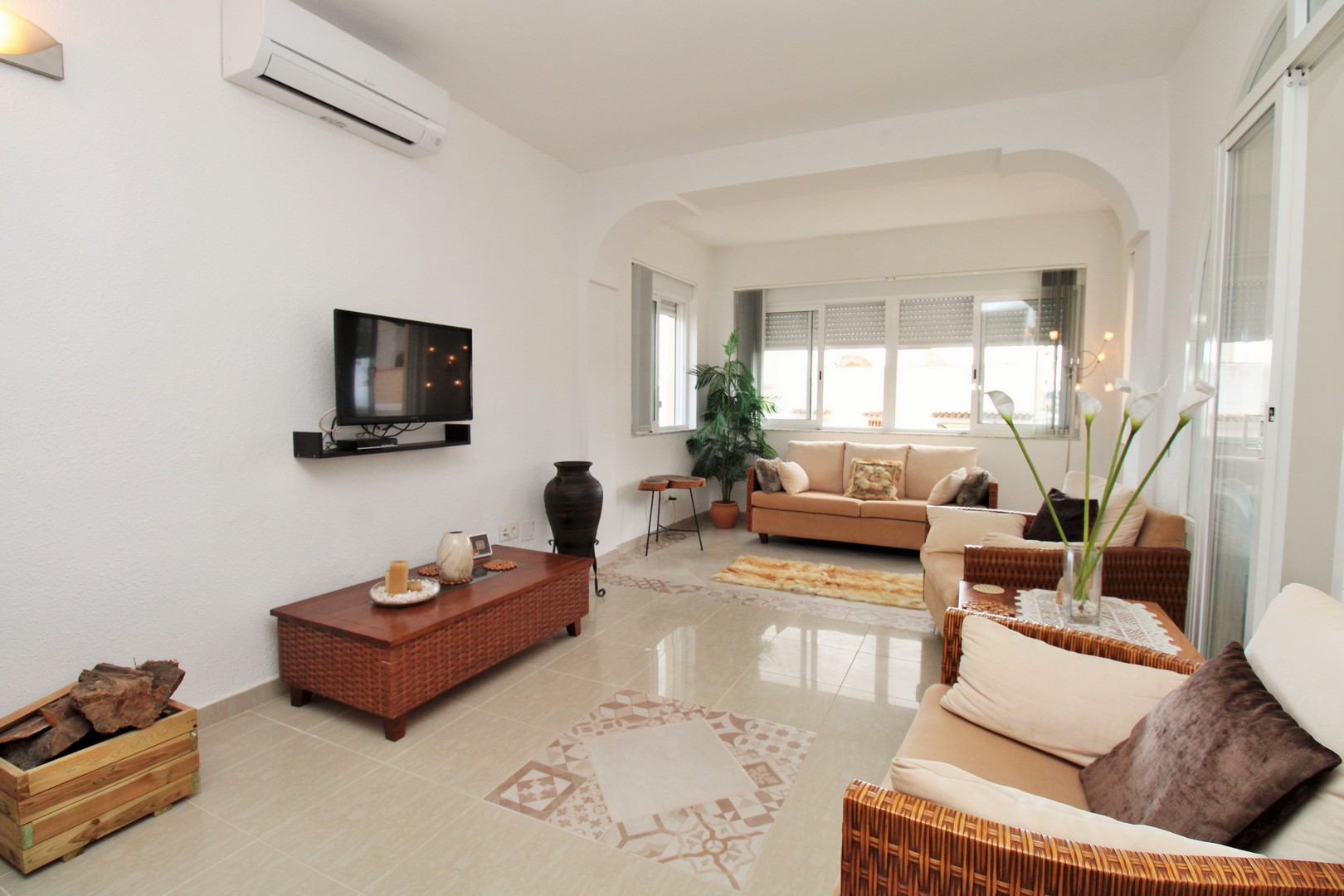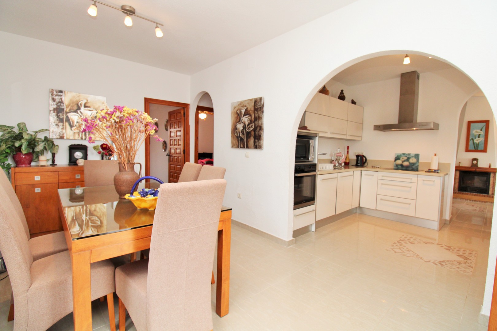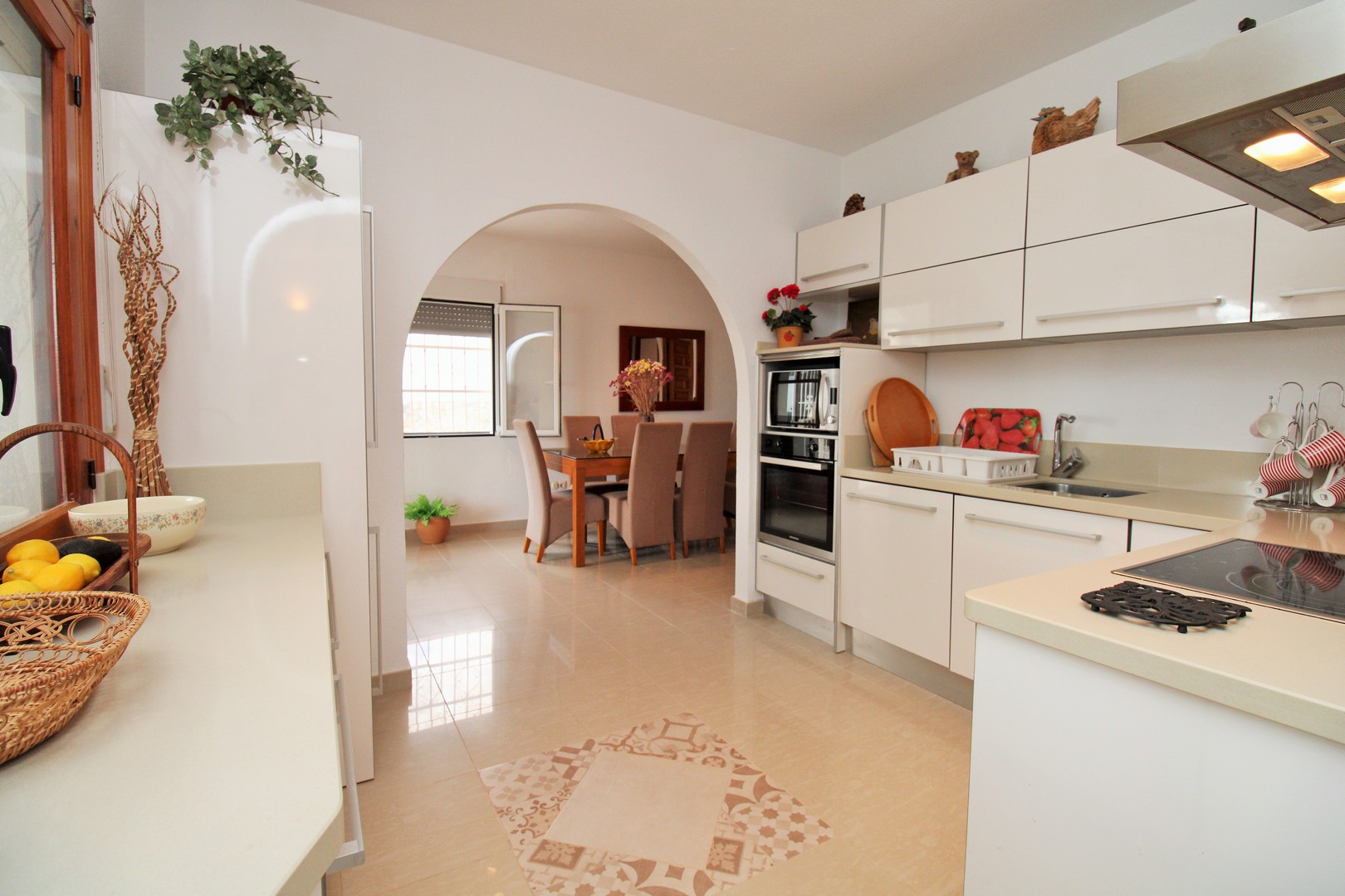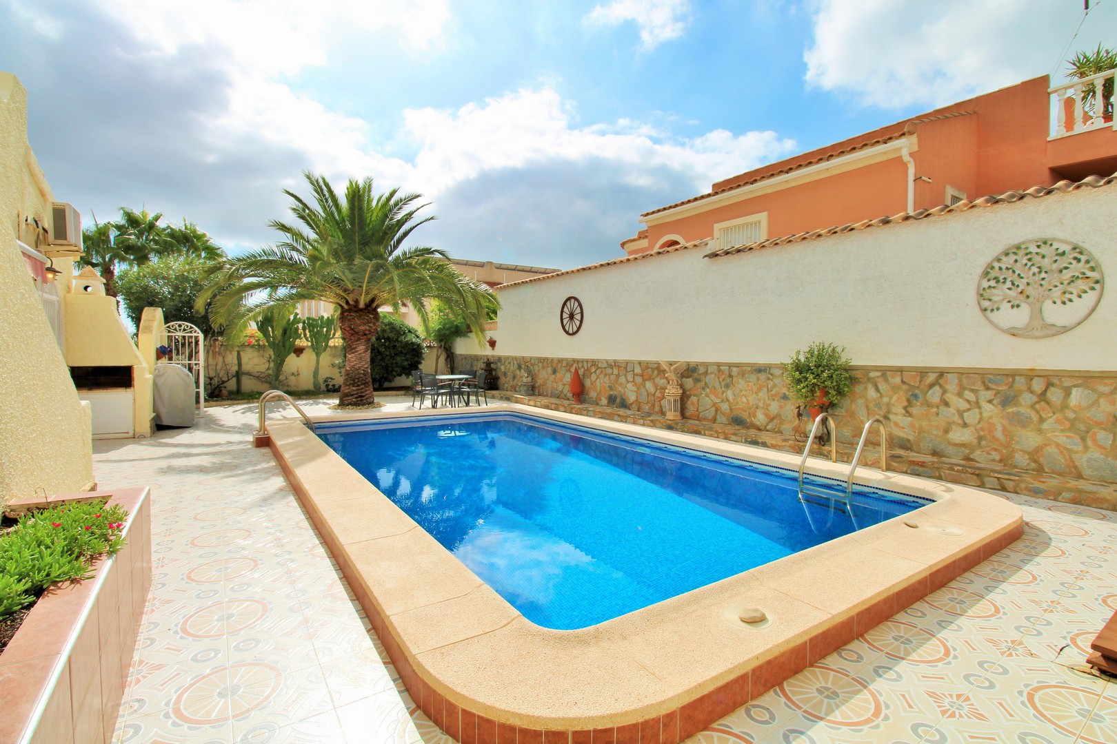 This well-presented four-bedroom detached villa with private swimming pool is situated in the Blue Lagoon area of Villamartin. Set on a 430m2 plot, the property offers the convenience of most of the living space arranged on a single level. Outside, there is a generous swimming pool, multiple terrace areas, a garage, and a roof solarium with open views towards the sea and countryside. The villa is ideally located just 500 metres from local amenities, including a selection of bars, restaurants, and shops. The main floor features an entrance porch leading into the dining area with a modern open-plan kitchen, a bright and spacious living room with fireplace, three double bedrooms with fitted wardrobes, and a family bathroom with walk-in shower. The master bedroom includes its own en-suite bathroom. A staircase from the entrance foyer leads down to the underbuild, which provides a large double bedroom with en-suite bathroom – an ideal space for guests. The villa also offers several outdoor terraces designed for privacy, along with a barbecue area, utility room, and views to the sea. The property has been carefully maintained by the current owners and is offered for sale furnished, with white goods and air-conditioning included. This villa makes an excellent permanent residence or holiday home, with golf courses at Villamartin, Campoamor, and Las Ramblas all close by. Villamartin Plaza is around a 15–20 minute walk, while the beaches of the Orihuela Costa and the Zenia Boulevard shopping centre are just a 10-minute drive. Viewings are strongly recommended.