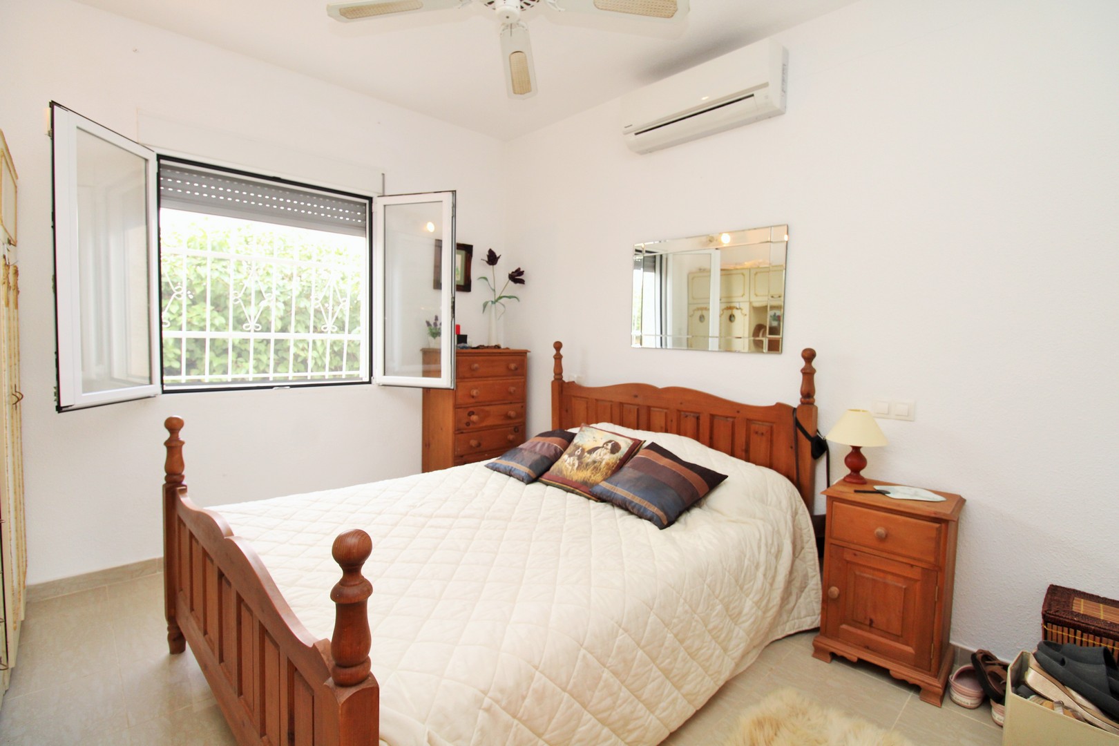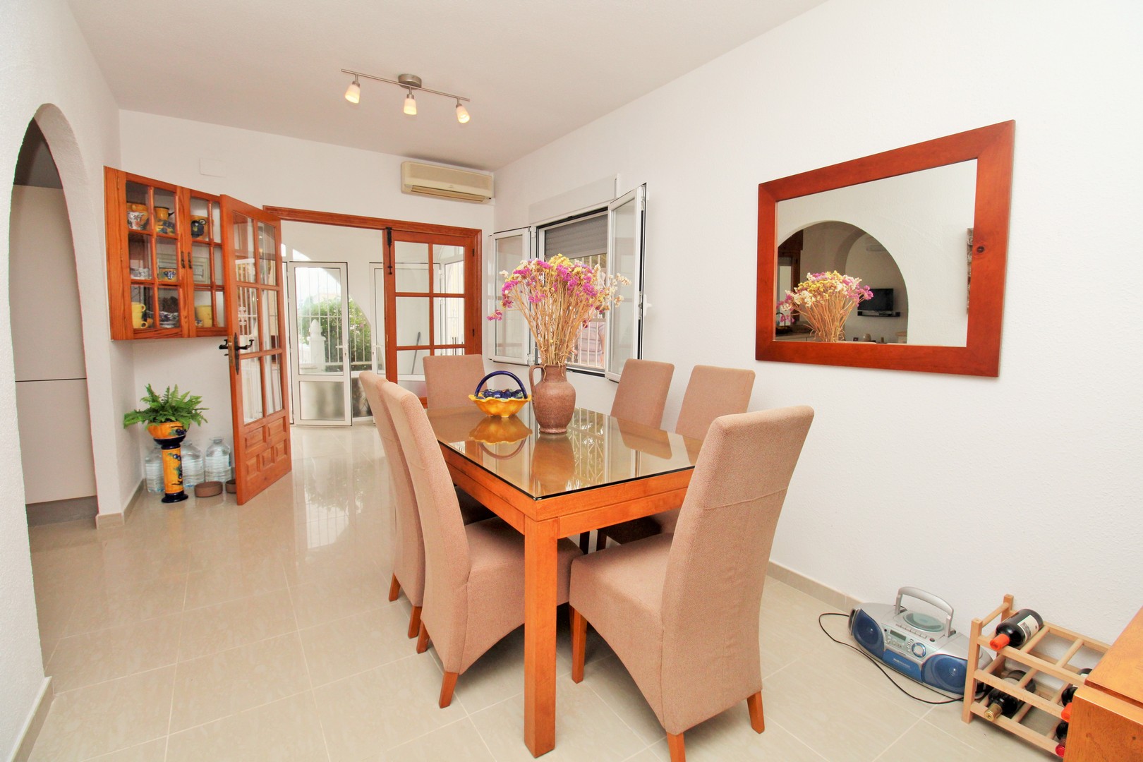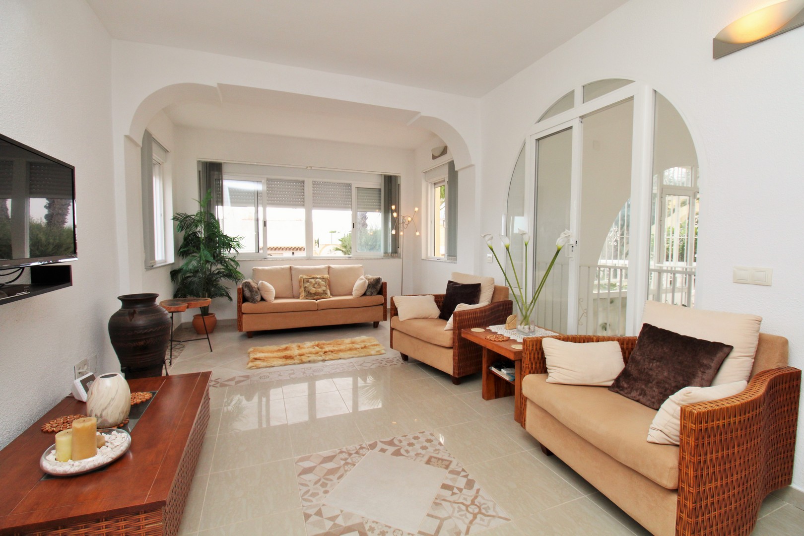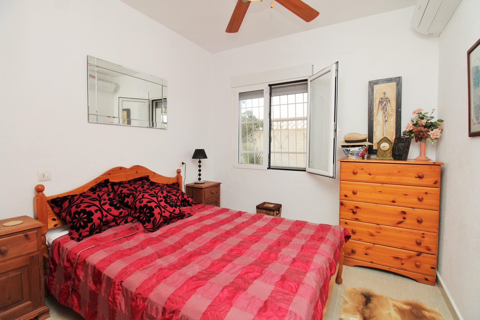 This well-presented four-bedroom detached villa with private swimming pool is situated in the Blue Lagoon area of Villamartin. Set on a 430m2 plot, the property offers the convenience of most of the living space arranged on a single level. Outside, there is a generous swimming pool, multiple terrace areas, a garage, and a roof solarium with open views towards the sea and countryside. The villa is ideally located just 500 metres from local amenities, including a selection of bars, restaurants, and shops. The main floor features an entrance porch leading into the dining area with a modern open-plan kitchen, a bright and spacious living room with fireplace, three double bedrooms with fitted wardrobes, and a family bathroom with walk-in shower. The master bedroom includes its own en-suite bathroom. A staircase from the entrance foyer leads down to the underbuild, which provides a large double bedroom with en-suite bathroom – an ideal space for guests. The villa also offers several outdoor terraces designed for privacy, along with a barbecue area, utility room, and views to the sea. The property has been carefully maintained by the current owners and is offered for sale furnished, with white goods and air-conditioning included. This villa makes an excellent permanent residence or holiday home, with golf courses at Villamartin, Campoamor, and Las Ramblas all close by. Villamartin Plaza is around a 15–20 minute walk, while the beaches of the Orihuela Costa and the Zenia Boulevard shopping centre are just a 10-minute drive. Viewings are strongly recommended.