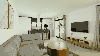 Day area: Here we find a spacious living-dining room with an open-plan kitchen (kitchen furniture included) that connects to the large modern porch through two large windows, leading to the landscaped outdoor area and the pool.