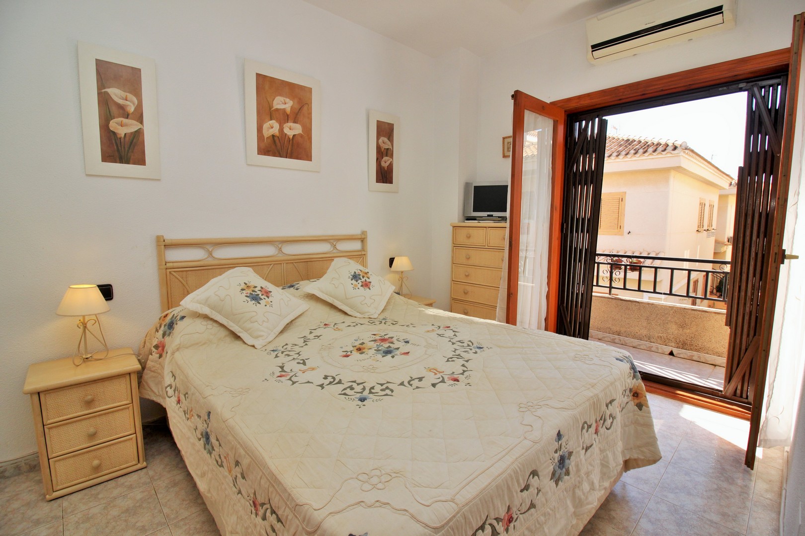 South facing 2 bedroom, 2 bathroom townhouse for sale in Res. Playa Flamenca IX. The property is located in the heart of Playa Flamenca, with all manner of amenities and services within walking distance, including the Zenia Boulevard shopping mall and the sandy blue flag beaches of Playa Flamenca. A fantastic property for permanent living or as a holiday home due to its prime location! The property offers a great front tiled garden with retractable awnings, a bright lounge-dining area with feature fireplace, fully equipped kitchen to the rear, plus a downstairs bathroom with walk-in shower. There is also a storage cupboard located underneath the stairs. Upstairs there are 2 bedrooms with fitted wardrobes, and a family bathroom with walk-in shower. The twin bedroom has access to a small utility area, where you will find the washing machine and electric boiler. From the master bedroom you can access the South facing balcony. Sold with furniture, white goods, air-conditioning and underfloor heating. Located just a 10 minutes walk to the Zenia Boulevard shopping mall, the biggest in the Alicante province with over 155 shops. Playa Flamenca beach is also a 15-20 minute walk away. Viewings advised for this centrally positioned property!