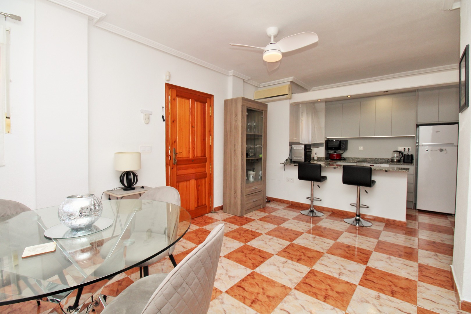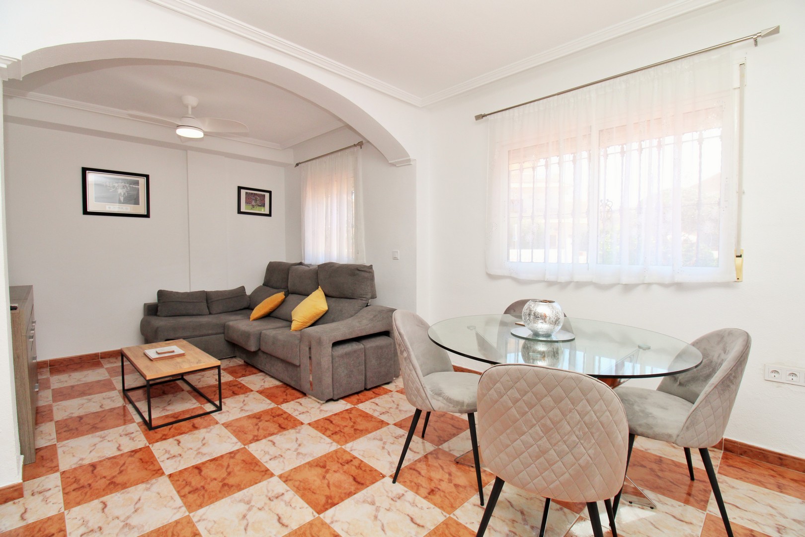 An excellent opportunity to acquire this bright and beautifully maintained South-facing quad, ideally situated in the peaceful and sought-after residential enclave of San Jose IV R7, La Zenia. The property is presented in superb condition throughout and occupies a large 139m2 garden, featuring a private driveway and a spacious sun-drenched terrace with retractable awnings—perfect for year-round enjoyment. The ground floor offers a welcoming, open-plan L-shaped living and dining area, a modernised American-style kitchen, and a convenient guest WC. Upstairs, there are two well-proportioned bedrooms with built-in wardrobes and a stylish family bathroom. The master bedroom benefits from its own private balcony. A further internal staircase leads to a large private solarium with an additional storage area. The property forms part of a well-maintained community with access to a nearby communal pool. It is offered furnished, including white goods and air conditioning—ready to move into immediately. Ideally positioned within walking distance of La Zenia’s popular Zenia Boulevard, a variety of restaurants, shops, and amenities, as well as the bustling Cabo Roig strip renowned for its vibrant nightlife. The beach of Cala Bosque (La Zenia) is just a 20 minutes walk away! Viewing is highly recommended to fully appreciate the setting, space, and potential of this fantastic home!