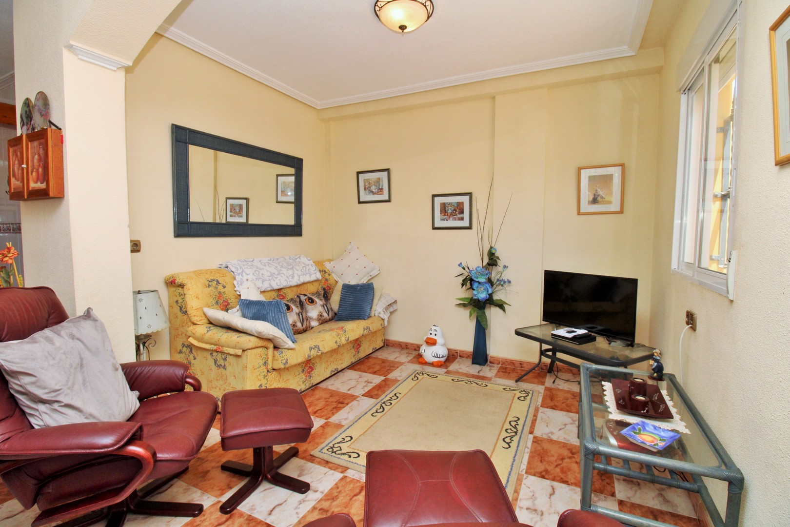 Ideally located in the highly desirable Villas de San Jose 1 community in Playa Flamenca, this beautifully maintained South-facing "Azucena" style quad house offers the perfect combination of comfort, privacy, and convenience. This 2-bedroom, 2-bathroom home is uniquely positioned facing the Estaca dry river bed—guaranteeing uninterrupted views and ensuring that no future building can ever obstruct your outlook. The property sits on a generous plot with a large private garden with some 156m2, a spacious driveway, and garage. The ground floor features a fully tiled garden area with ample outdoor seating space, an enclosed porch with retractable windows, and a bright, open-plan living and dining area. The kitchen comes fully equipped with white goods, and there's a handy guest WC just off the main hallway. Upstairs, you'll find two double bedrooms with built-in wardrobes, including a master bedroom that opens onto a private enclosed balcony—ideal for relaxing or working from home. A full family bathroom is also located on this level. An internal staircase leads to a private rooftop solarium that enjoys all-day sun with views of the sea. Part of the solarium has been enclosed, creating a versatile additional room that can serve as a guest bedroom, office, or hobby space. There is also an underbuild storage room, offering excellent space for tools, bikes, or seasonal items. The property is being sold fully furnished and includes air-conditioning. Residents of Villas de San Jose benefit from access to a well-maintained communal pool and garden areas, all within easy walking distance of Zenia Boulevard, local shops, cafes, restaurants, the weekly Saturday market, and the beach. With its unbeatable location, generous outdoor space, and rare uninterrupted views, this home is a must-see. Early viewings are strongly recommended.