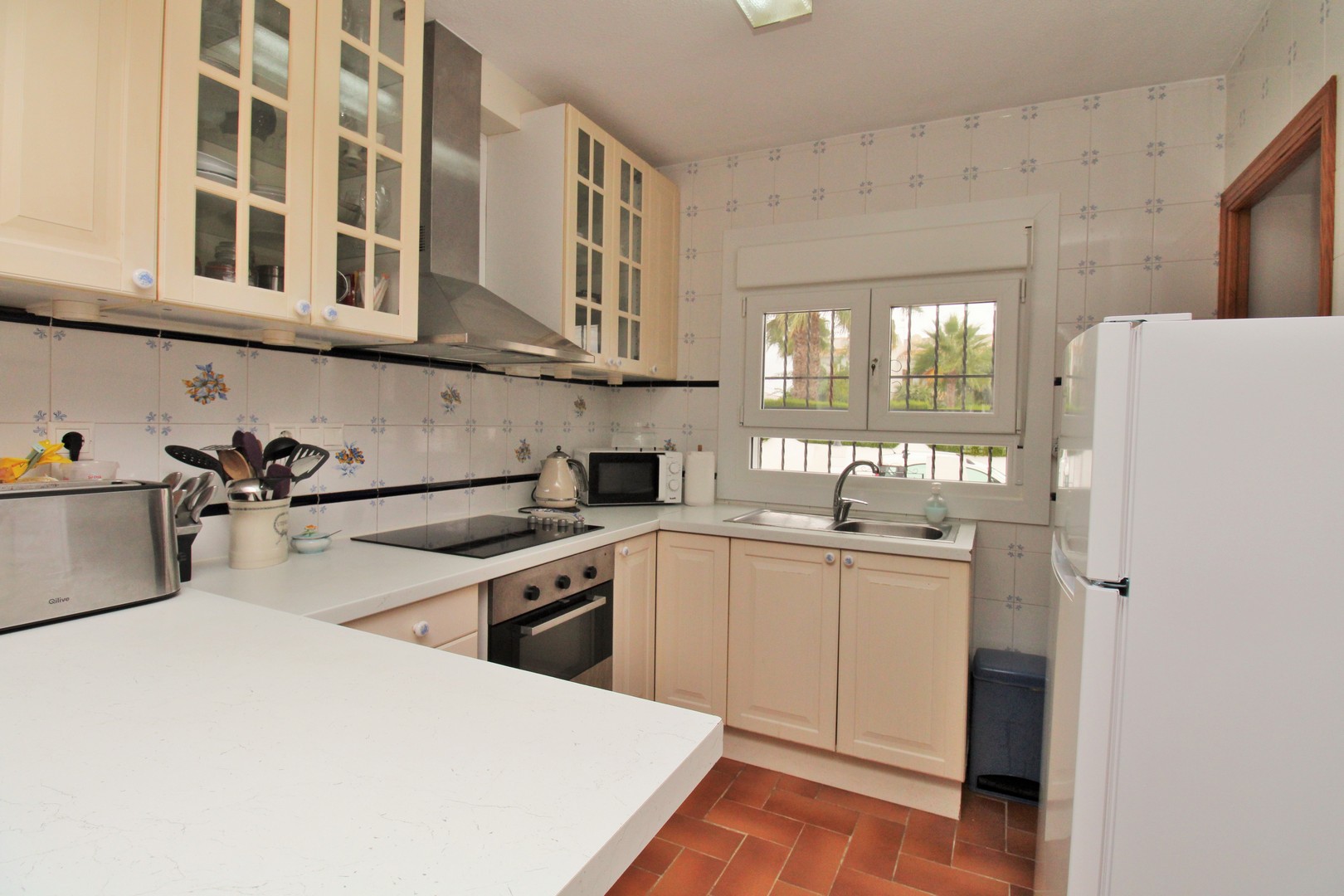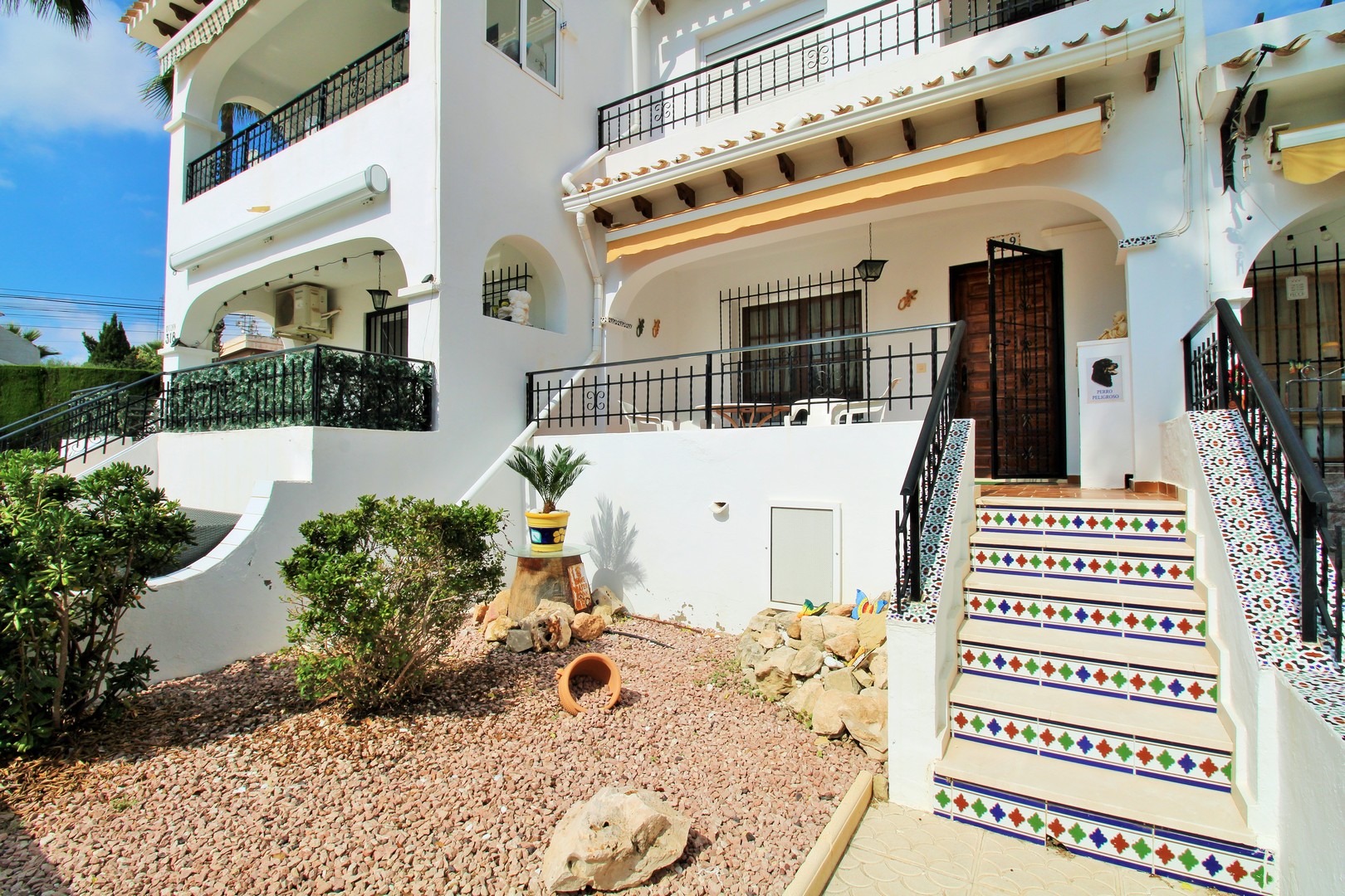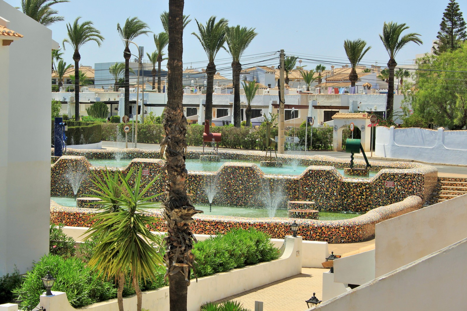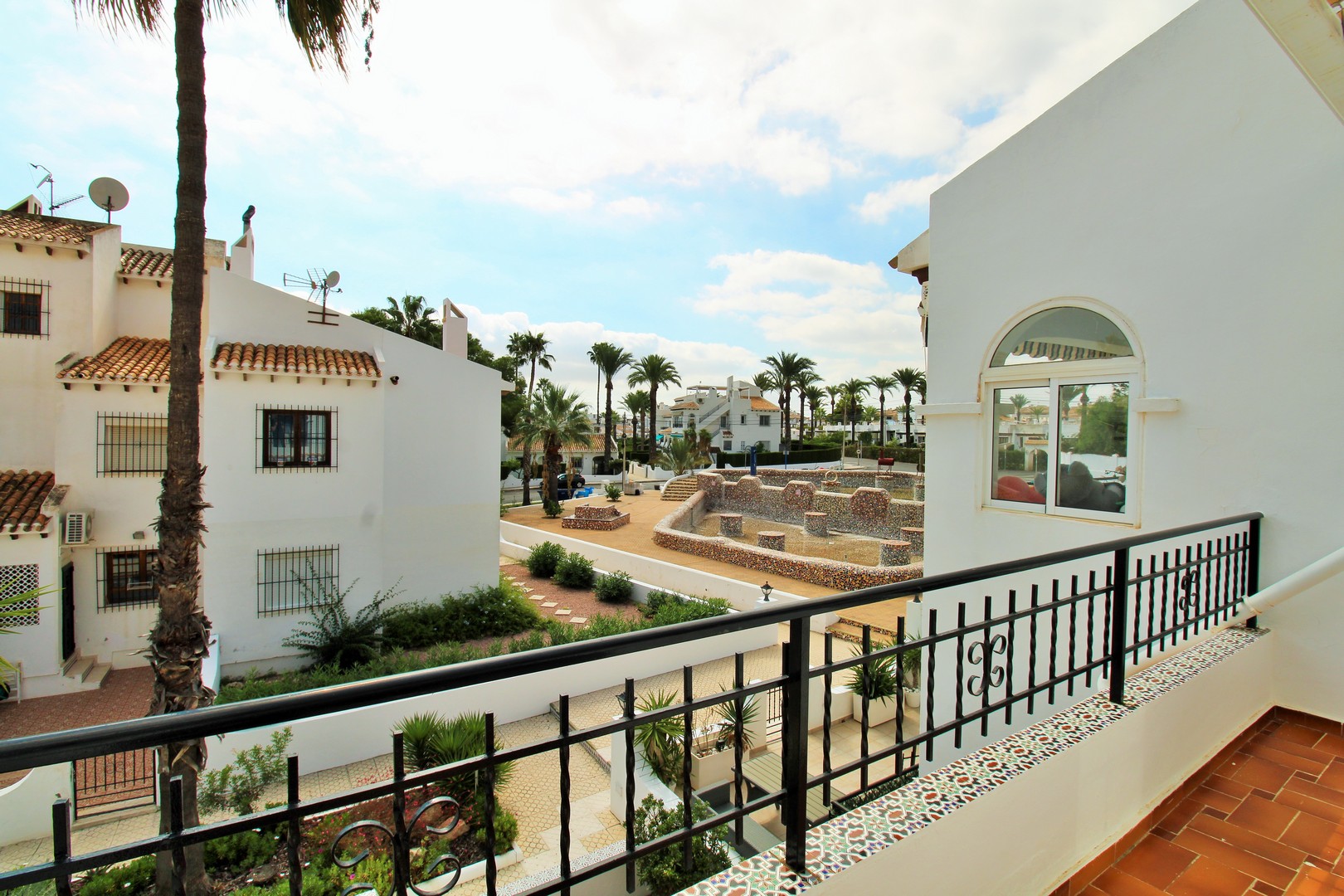 A lovely South-facing Sofia style townhouse situated in the sought-after urbanisation of Verdemar III in Villamartin. The property enjoys a superb outlook towards the main water fountain of Verdemar III, and offers generous outdoor space, including front and rear gardens, a covered terrace, and a private roof solarium with sea views. The ground floor features a spacious lounge–dining area with guest WC, an open-plan kitchen to the rear, and a utility room with direct access to the back garden. Upstairs, there are two double bedrooms with fitted wardrobes and a family bathroom. The main bedroom benefits from a private South-facing balcony overlooking the central fountain of Verdemar III. Internal stairs from the landing lead to the roof solarium, which offers far-reaching views of the sea. The property is sold furnished and includes air-conditioning. Verdemar III is renowned for its beautifully landscaped communal gardens and two exceptional swimming pools. The grounds feature charming water features and ponds, all carefully maintained. Ideally located less than 800 metres from La Fuente commercial centre—with its wide choice of restaurants, bars, and two supermarkets—the property is also just a few minutes’ drive from the golf courses of Villamartín, Campoamor, and Las Ramblas. The beaches and Zenia Boulevard shopping centre can be reached in under ten minutes by car.