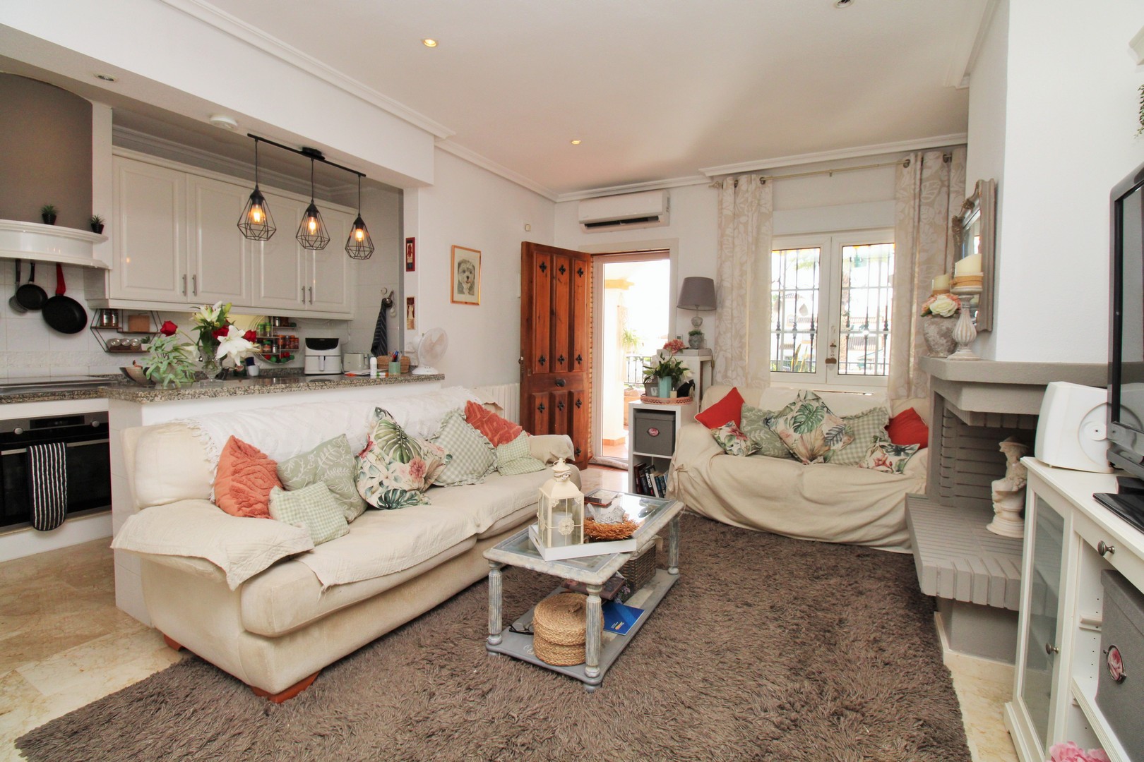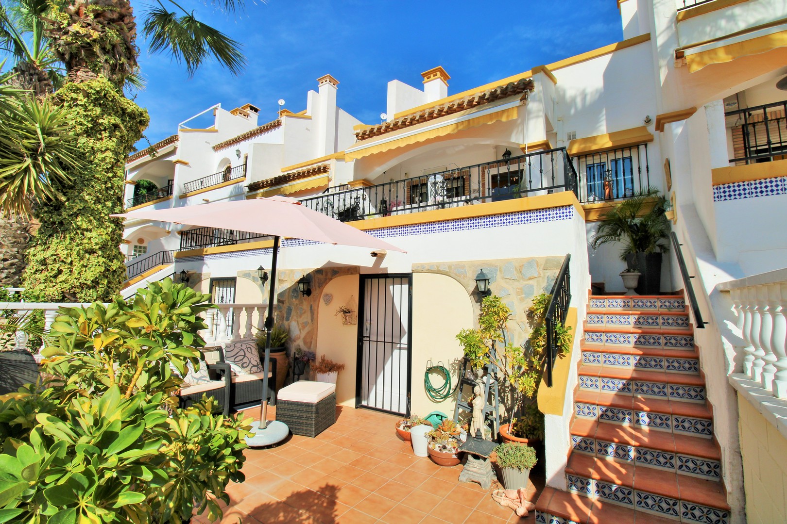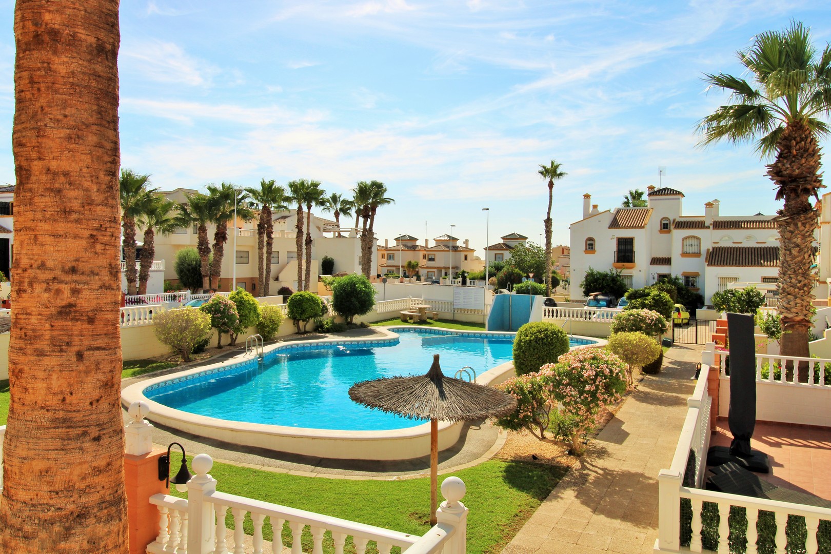 A superb example of the ever-popular Buhardilla-style townhouse, ideally located in the sought-after R19 area of Los Dolses. Set within a secure gated community, the property enjoys one of the best positions in the development, directly overlooking the beautiful communal swimming pool. The ground floor offers a bright and spacious lounge–dining area with an open-plan kitchen and adjoining utility space. To the rear are two double bedrooms with fitted wardrobes, together with a family bathroom. French doors from one of the bedrooms open onto the rear tiled garden/terrace, complete with retractable awnings for shade and comfort. To the front, there is an additional tiled garden with a raised, covered terrace which overlooks the pool, beneath which is a useful storage room. On the first floor, the master bedroom features high ceilings, an en-suite bathroom with walk-in shower, ample storage within the built-in storeroom, and direct access to a large private solarium. The solarium can also be reached from the landing and enjoys sunshine throughout the day and views of the pool. The house has been well maintained throughout and benefits from gas central heating, ensuring comfort all year round. Sold furnished with white goods, and air-conditioning. For further details or to arrange a viewing, please get in touch today.
