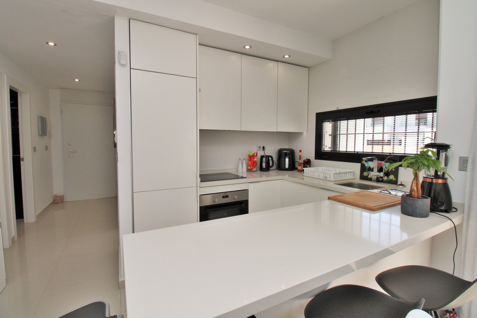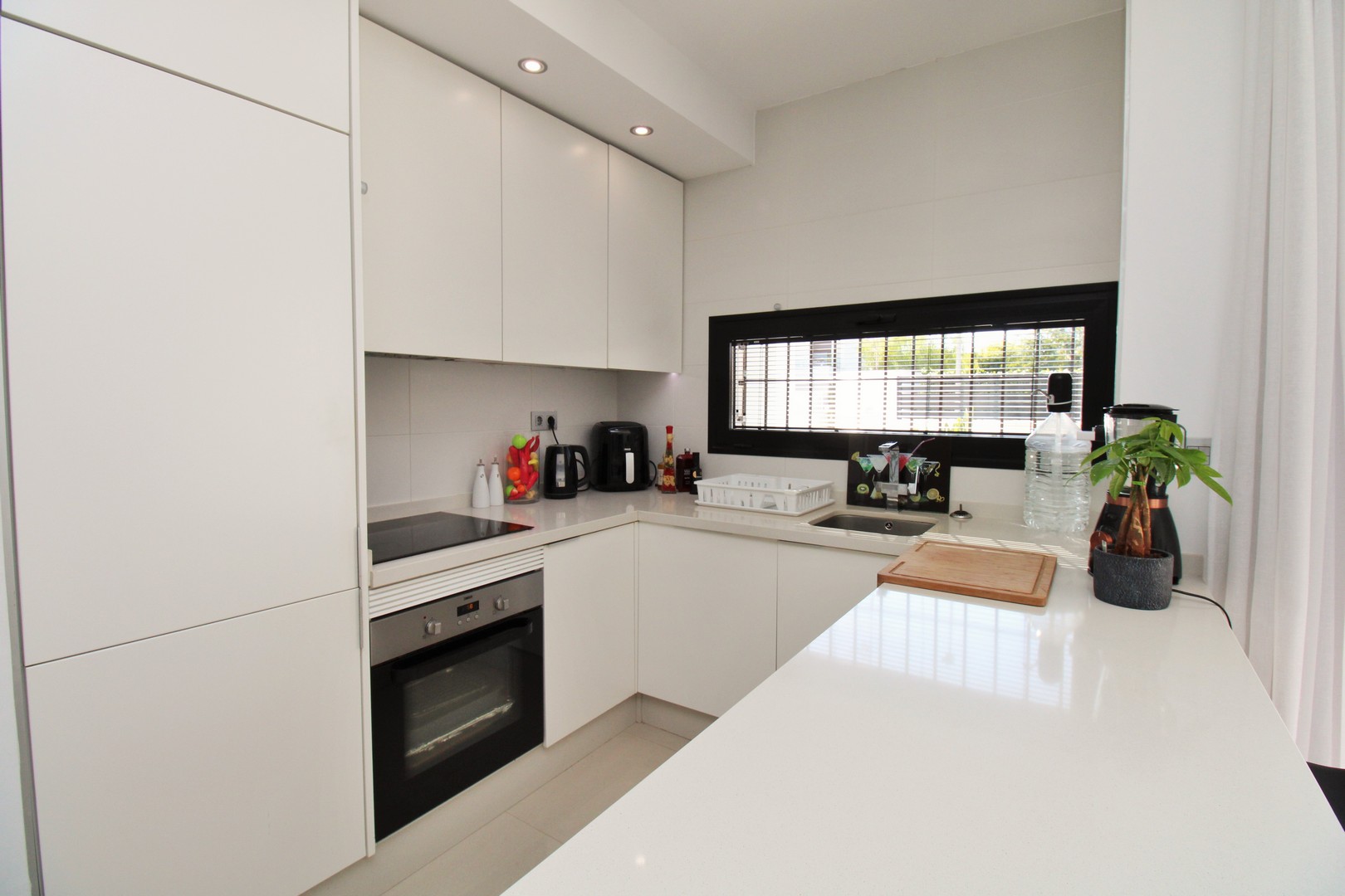 This beautifully presented South facing 3-bedroom, 2-bathroom detached villa in Villamartin offers a perfect blend of modern comfort and outdoor living. Situated on a generous corner plot, the property features a private swimming pool, off-road parking, a balcony, and a spacious roof solarium with panoramic views of the Torrevieja salt lakes. Thanks to its ideal orientation, the villa enjoys sunshine throughout the day. Inside, the ground floor boasts a bright and airy lounge-dining area with a stylish feature fireplace, complemented by an open-plan, fully fitted kitchen. This level also includes a double bedroom with fitted wardrobes, a contemporary bathroom with a walk-in shower, and a convenient storage/utility room. Upstairs, you’ll find two additional double bedrooms with fitted wardrobes and a sleek family bathroom with a walk-in shower. The master bedroom and landing open onto a private balcony, with external stairs leading to the expansive roof solarium—an ideal spot for barbecues and entertaining while taking in the stunning views. The villa is sold partially furnished with white goods and comes with premium features, including ducted air-conditioning throughout, underfloor heating in the bathrooms, electric blinds, a water softener system, and a heating pump for the pool—perfect for year-round enjoyment. Positioned on the most desirable plot in the development, this home also benefits from no community fees, just the yearly council tax. Conveniently located just 900m from an ALDI supermarket and the Via Park III commercial centre, which offers a variety of bars, restaurants, and essential services, including a pharmacy. The Villamartin Plaza and golf course are just a short drive away, as are the blue flag beaches of the Orihuela Costa and the popular Zenia Boulevard shopping mall.