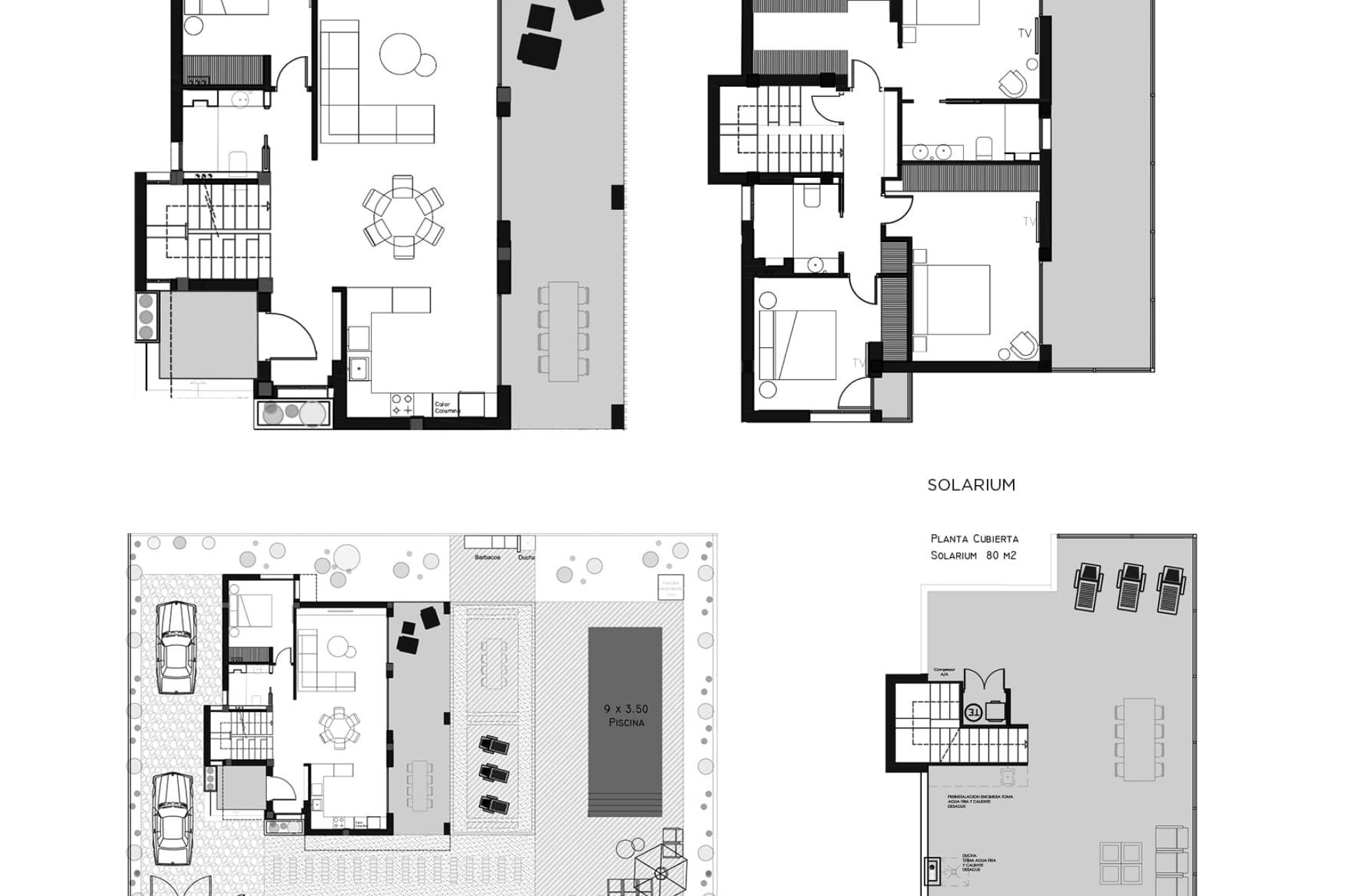 De buitenkant van deze woningen is een ware oase van ontspanning. Elke woning heeft een privé tuin, perfect om te genieten van het mediterrane klimaat. De aanwezigheid van een privézwembad voegt een vleugje luxe toe, waardoor je kunt afkoelen op de warmste dagen. Bovendien bieden de terrassen en het solarium extra buitenruimtes voor recreatie, ideaal voor familiebijeenkomsten of gewoon om van een rustig moment te genieten. De pergola biedt schaduw en een gezellige plek om te ontspannen tijdens de intense zonuren.
