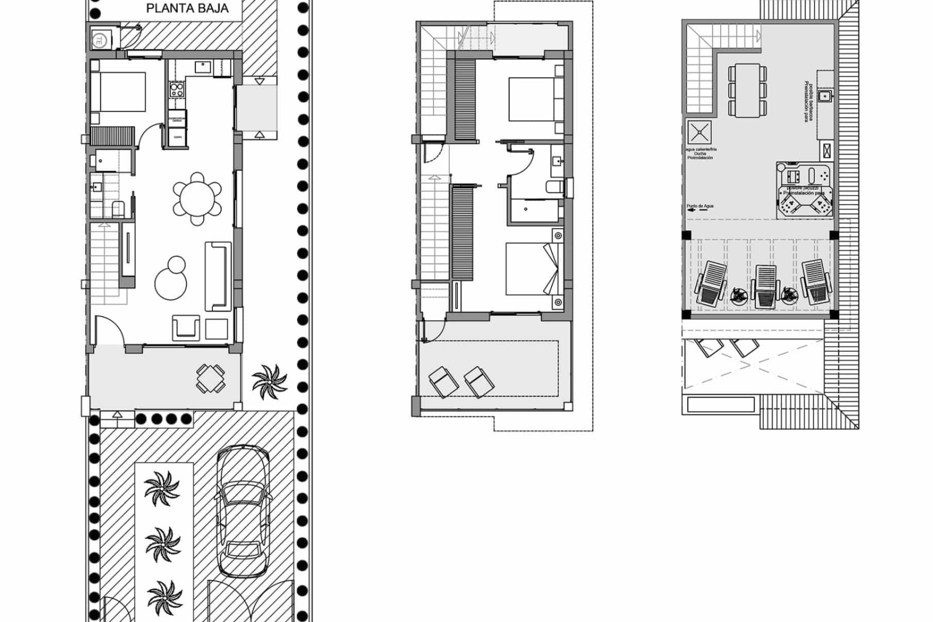 De buitenruimtes van deze woningen zijn ontworpen om optimaal te genieten van het mediterrane klimaat. Elke woning heeft een privé tuin, perfect om te ontspannen of om van buitenactiviteiten te genieten. De aanwezigheid van een privézwembad voegt een vleugje luxe toe, waardoor je kunt afkoelen op de warmste dagen. Daarnaast beschikken de woningen over een terras en een solarium, wat meerdere ruimtes biedt om buiten te ontspannen of te socializen. De toevoeging van een pergola biedt schaduw en stijl, waardoor een gezellige en elegante sfeer buiten ontstaat.