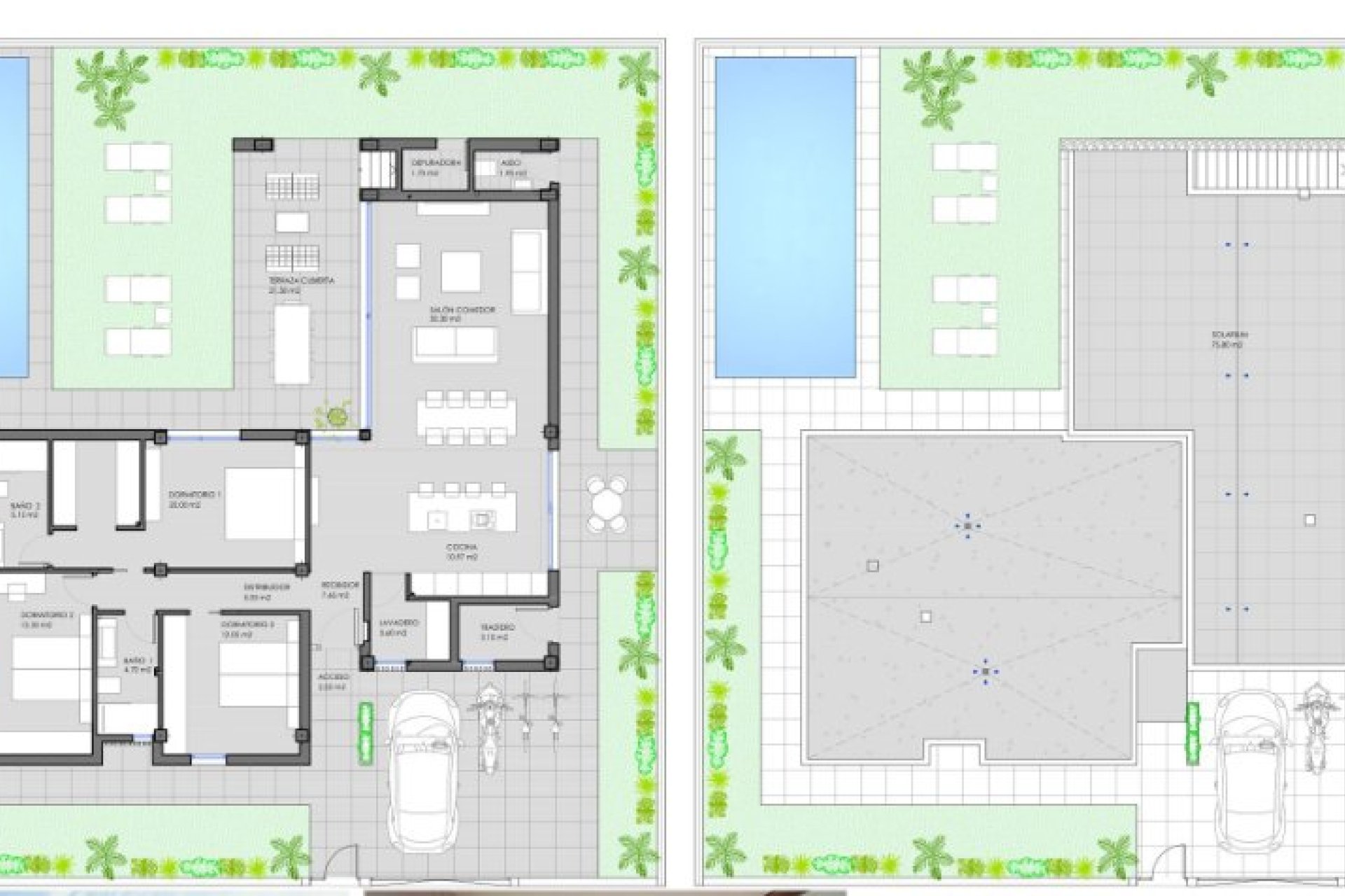 De buitenruimtes van deze vrijstaande woningen in Mar de Cristal zijn ontworpen om optimaal te genieten van het mediterrane klimaat. Elke woning heeft een privézwembad, perfect om af te koelen tijdens de warme zomerdagen. De terrassen bieden extra ruimte om buiten te ontspannen, of het nu gaat om zonnebaden of genieten van een diner in de open lucht. Het solarium is een andere attractie, die een ideale plek biedt om van het uitzicht te genieten en rustige momenten te beleven. De aanwezigheid van een privégarage zorgt voor comfort en veiligheid voor het parkeren van voertuigen.